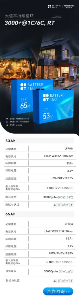 在此情况下,兰钧新能源带来了53Ah&65Ah LFP电芯,能量密度145-180Wh/kg,循环寿命6000次以上,可面向UPS等多元应用场景。
