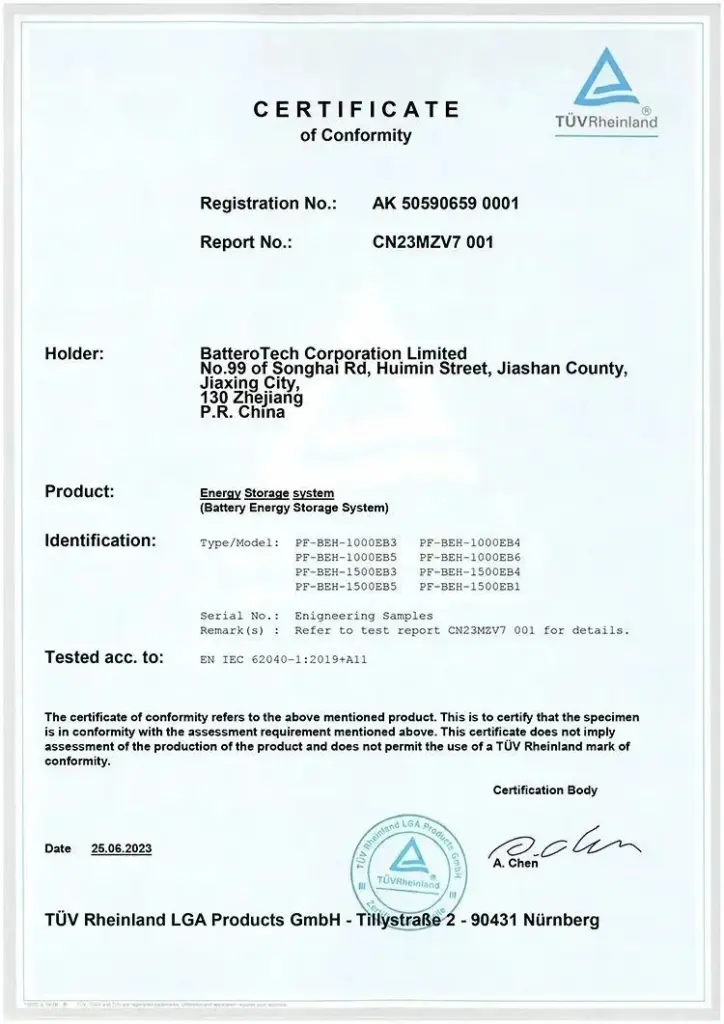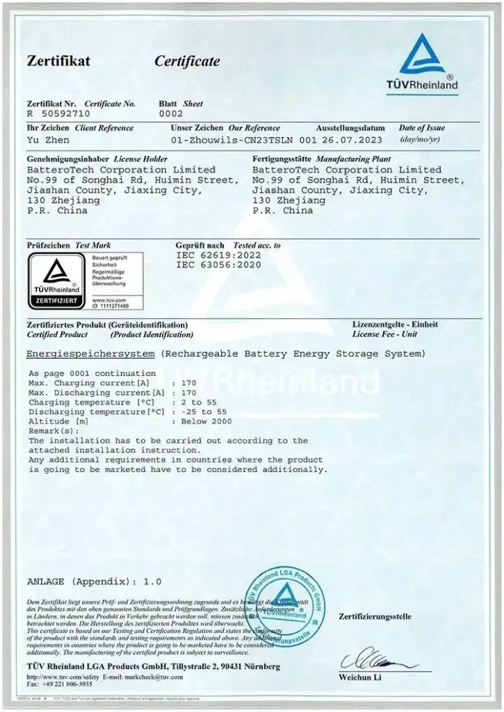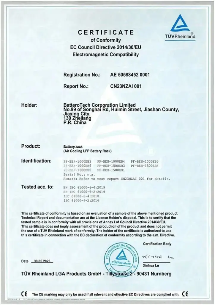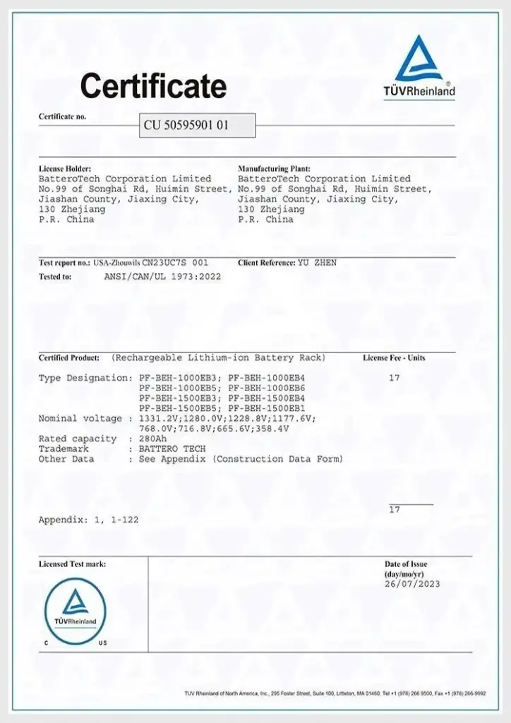 近日,兰钧新能源280Ah风冷插箱、电池簇1000V/1500V双平台储能系统均通过了德国莱茵TÜV Rheinland颁发的IEC 62619、IEC 63056、IEC 62477、IEC 61000、IEC 60730五项国际权威报告及认证,以及UL 1973、UL 9540A两项美标权威认证,这标志着兰钧新能源风冷电池插箱及电池簇在安全性能上已经达到了国际标准要求,获得了通往国际市场的通行证。除此之外,该产品也同步取得海关颁发的UN38.3测试报告及配套的运输鉴定,以满足出口运输安全。