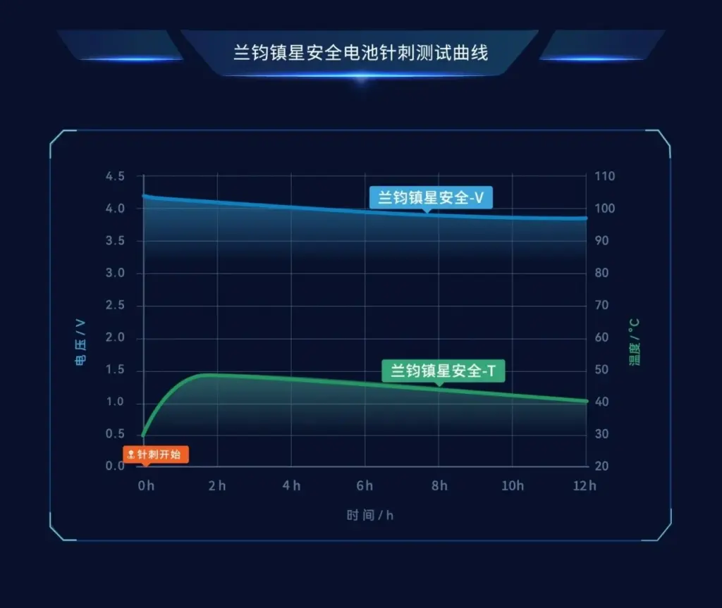 近期,兰钧新能源镇星安全电池顺利通过了针刺测试,实现了针刺不开阀、不起火、不爆炸,测试全程最高温度<50℃,钢针停留在电池内放置12h电压稳定的优异表现。