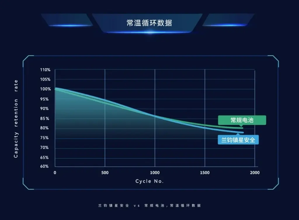 循环方面,兰钧新能源镇星安全电池与常规高镍三元电芯相比,循环容量保持率几乎没有差距,电池使用寿命不打折扣。