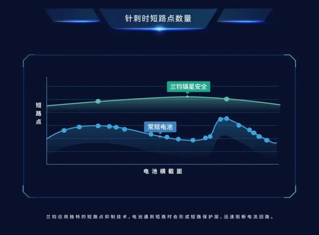 安全方面:兰钧应用独特的短路点抑制技术,电池遇到短路时会形成短路保护层,迅速阻断电流回路,防止电池升温,从源头解决产热问题。
