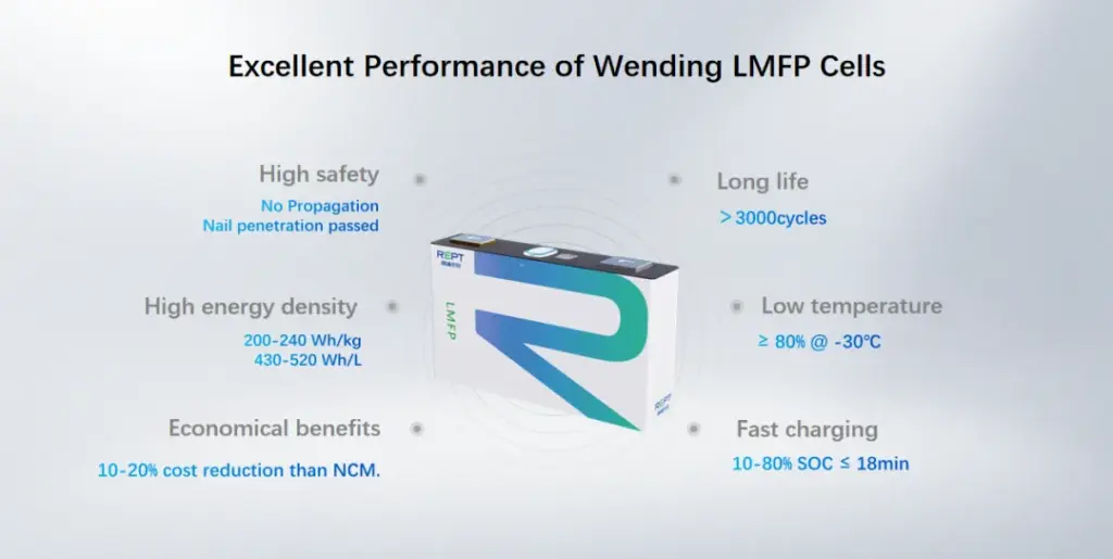 瑞浦兰钧引领市场趋势,拓展技术边界,推出了磷酸锰铁锂(LMFP)电池。瑞浦兰钧推出的LMFP电池综合了LFP电池和NCM电池的优势性能,叠加独创的问顶®技术后,电芯体积能量密度最高可达520Wh/L,可助力纯电乘用车续航里程达700km以上;电芯阻抗降低16%,减少多余热量产生;保证-30℃下放电容量保持率仍能达到80%以上;实现10-80%SOC 小于18min的快充能力。