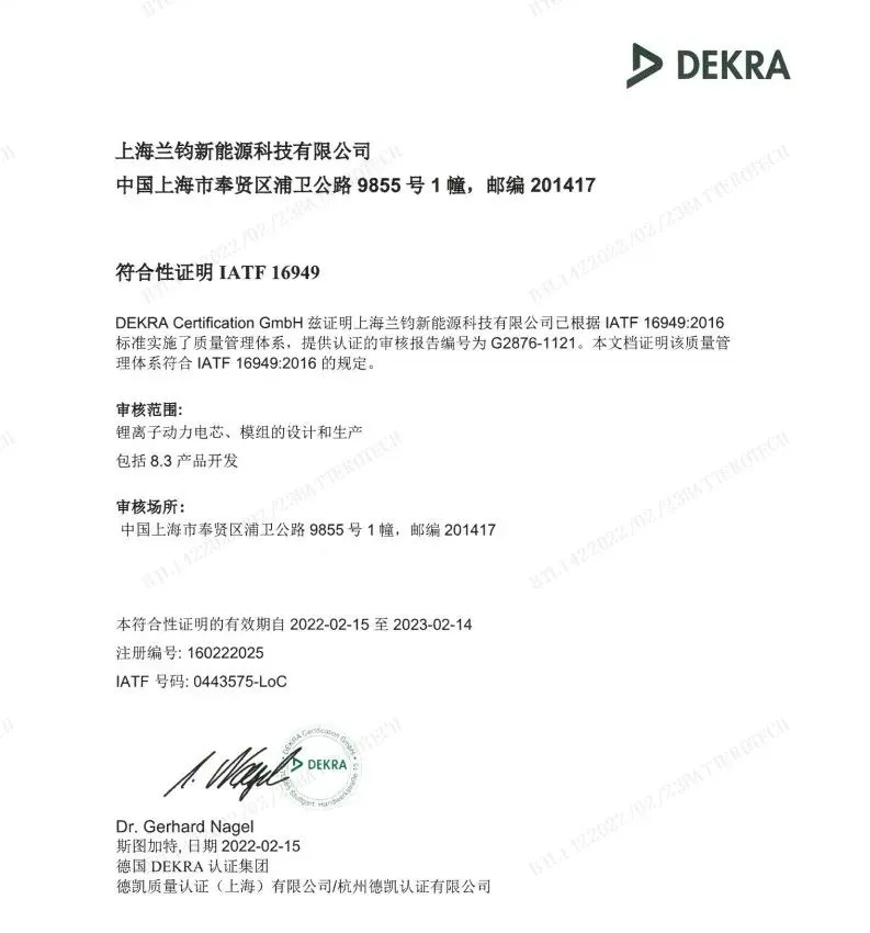 兰钧新能源IATF16949汽车行业质量管理体系认证工作,经过长期的积极准备,于近期顺利通过了德国机动车协会(DEKRA)的审核,2月15号正式收到了IATF16949 2016汽车行业质量管理体系LOC认证证书和ISO:9001 2015证书,这是兰钧发展过程中对产品品质提出更高要求的需要。IATF16949体系要求内容包含了lSO体系所有内容,是更高更全面的体系,获得此项认证对于兰钧意义重大。
